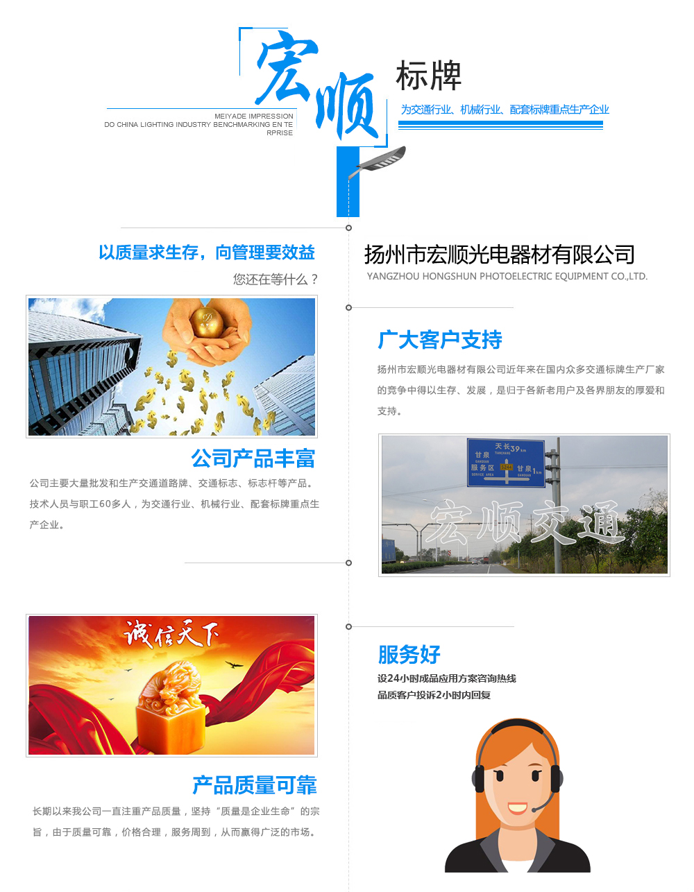 揚(yáng)州市宏順光電器材有限公司近年來(lái)在國(guó)內(nèi)眾多交通標(biāo)牌生產(chǎn)廠家的競(jìng)爭(zhēng)中得以生存、發(fā)展,是歸于各新老用戶及各界朋友的厚愛(ài)和支持。我們?nèi)w員工向你們致以誠(chéng)摯的感謝。 為使我們共同步入新世紀(jì),提高我們的產(chǎn)品質(zhì)量與服務(wù)希望對(duì)我們提出寶貴的意見,使我們不斷改進(jìn)、創(chuàng)新。 我們將和過(guò)去一樣,視今天的質(zhì)量為明天的市場(chǎng)。為您奉獻(xiàn)滿意的各種精品,為美化我們的交通事業(yè)做出貢獻(xiàn)。 公司主要大量批發(fā)和生產(chǎn)道路交通標(biāo)志牌、道路指示牌、交通標(biāo)志牌、指路牌、反光標(biāo)志牌等產(chǎn)品。技術(shù)人員與職工60多人,為交通行業(yè)、機(jī)械行業(yè)、配套標(biāo)牌重點(diǎn)生產(chǎn)企業(yè)。 長(zhǎng)期以來(lái)我公司一直注重產(chǎn)品質(zhì)量,堅(jiān)持“質(zhì)量是企業(yè)生命”的宗旨,由于質(zhì)量可靠,價(jià)格合理,服務(wù)周到,從而贏得廣泛的市場(chǎng),近年來(lái)隨著交通事業(yè)的開發(fā)和研究,傾聽用戶的意見,使得我們?cè)谑袌?chǎng)競(jìng)爭(zhēng)中不斷發(fā)展壯大。 我們本著“質(zhì)量可靠、信譽(yù)優(yōu)先、用戶至上”的宗旨,“以質(zhì)量求生存,向管理要效益”的信條,竭誠(chéng)為... ...【查看更多】